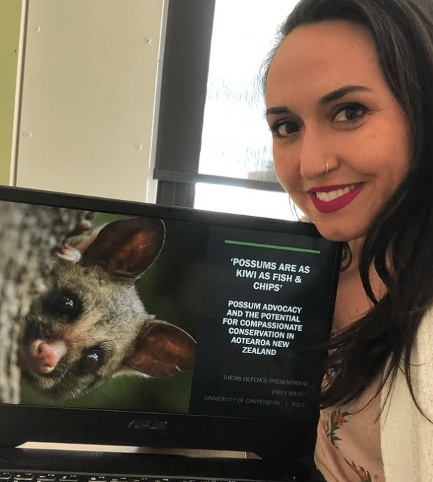 Major, E. (2023). ‘Possums are as Kiwi as fish and chips’: Possum Advocacy and the Potential for Compassionate Conservation in Aotearoa New Zealand (Doctoral thesis, University of Canterbury). https://ir.canterbury.ac.nz/bitstreams/682e3e73-75d3-4811-b621-f6279cd502fd/download